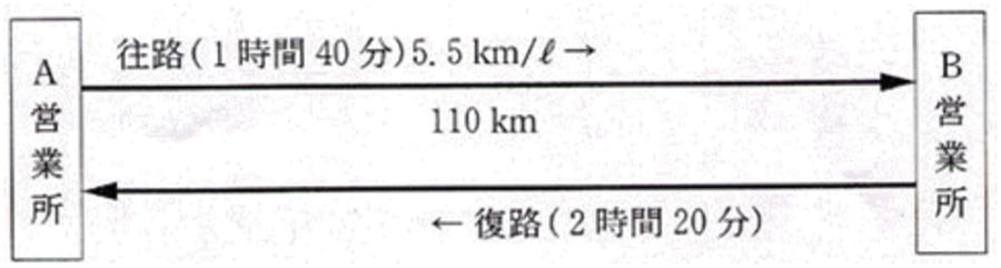問30 トラックが、下図のようにA営業所とB営業所間の110キロメートルを往復したところ、往路は1時間40分、復路は2時間20分かかり、合わせて45リットルの燃料を消費した。