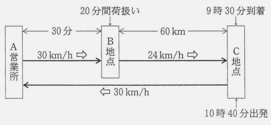 とする。)でA営業所に戻ることとし、その間は平均時速30キロメートルで走行できると判断した。