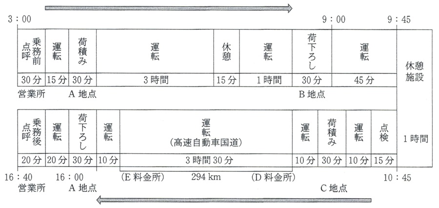 A地点から、重量が5,250キログラムの荷を9時までにB地点に運び、その後戻りの便にて、C地点から4,500キログラムの荷を16時までにA地点に運ぶ。