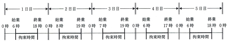 問23 下図は、貨物自動車運送事業に従事する自動車運転者の5日間の勤務状況の例を示したものであるが、次の1~4の拘束時間のうち、「自動車運転者の労働時間等の改善のための基準」における1日についての拘束時間として、正しいものを1つ選び、解答用紙の該当する欄にマークしなさい。