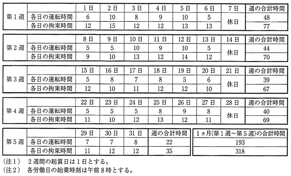1.当該5週間のすべての日を特定日とした2日を平均し1日当たりの運転時間(以下「1日当たりの運転時間」という。)及び2週間を平均し1週間当たりの運転時間(以下「1週間当たりの運転時間」という。)は、改善基準に違反しているものがある。