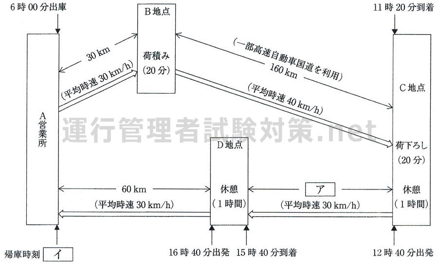 イ 当該運転者がA営業所に帰庫する時刻について、次の1~3の中から正しいものを1つ選び、解答用紙にマークしなさい。