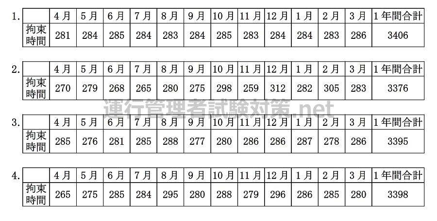問23 下表は、貨物自動車運送事業に従事する自動車運転者(隔日勤務に就く運転者以外のもの。)の1年間における各月の拘束時間の例を示したものであるが、このうち、「自動車運転者の労働時間等の改善のための基準」に【適合するものを1つ】選びなさい。ただし、「1ヵ月及び1年についての拘束時間の延長に関する労使協定」があるものとする。(※法改正により一部改変)