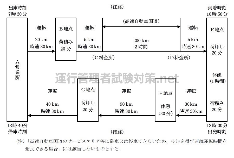 A営業所を出庫し、B地点で荷積みし、E地点で荷卸し、休憩の後、E地点で荷積みし、戻りの便にて、F地点で休憩し、G地点で荷卸しした後、A営業所に帰庫する行程とする。当該運行は、車両総重量8トン、最大積載量5トンの中型トラックを使用し、運転者1人乗務とする。