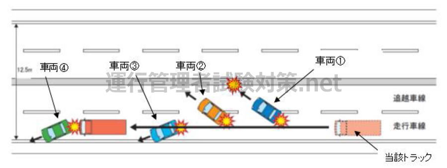 当該トラックは、17時頃、霧で見通しの悪い高速道路を走行中、居眠り運転により渋滞車列の最後尾にいた乗用車に追突した。当該トラックは当該乗用車を中央分離帯に押し出したのち、前方の乗用車3台に次々と追突し、通行帯上に停止した。