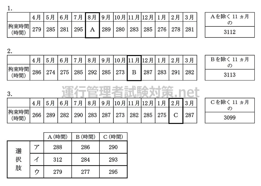 問23 下表の1~3は、貨物自動車運送事業に従事する自動車運転者(隔日勤務に就く運転者以外のもの)の1年間における各月の拘束時間の例を示したものである。下表の空欄A、B、Cについて、次の選択肢ア~ウの拘束時間の組み合わせをあてはめた場合、「自動車運転者の労働時間等の改善のための基準」に【適合するものを選択肢ア~ウの中から1つ】選びなさい。なお、解答にあたっては「1ヵ月及び1年についての拘束時間の延長に関する労使協定」があるものとし、下表に示された内容及び各選択肢に記載されている事項以外は考慮しないものとする。(※法改正により一部改変)