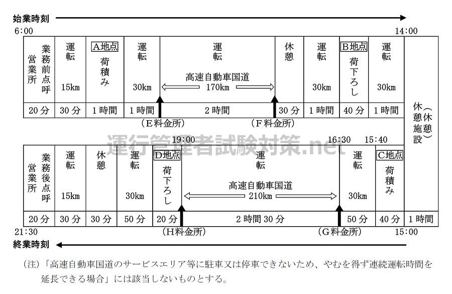 問29 運行管理者は、荷主からの運送依頼を受けて、下の図に示す運行計画を立てた。この運行に関する次の1~3の記述について、解答しなさい。なお、解答にあたっては、<運行計画>及び各選択肢に記載されている事項以外は考慮しないものとする。(※法改正により一部改変)