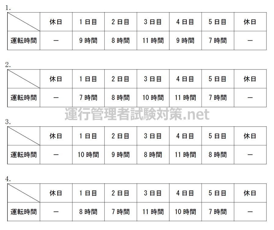 問22 下表の1~4は、貨物自動車運送事業に従事する自動車運転者の5日間の運転時間の例を示したものであるが、このうち、5日間すべての日を特定日とした2日を平均し1日当たりの運転時間が「自動車運転者の労働時間等の改善のための基準」に違反しているものをすべて選びなさい。なお、解答にあたっては、下表に示された内容以外は考慮しないものとする。