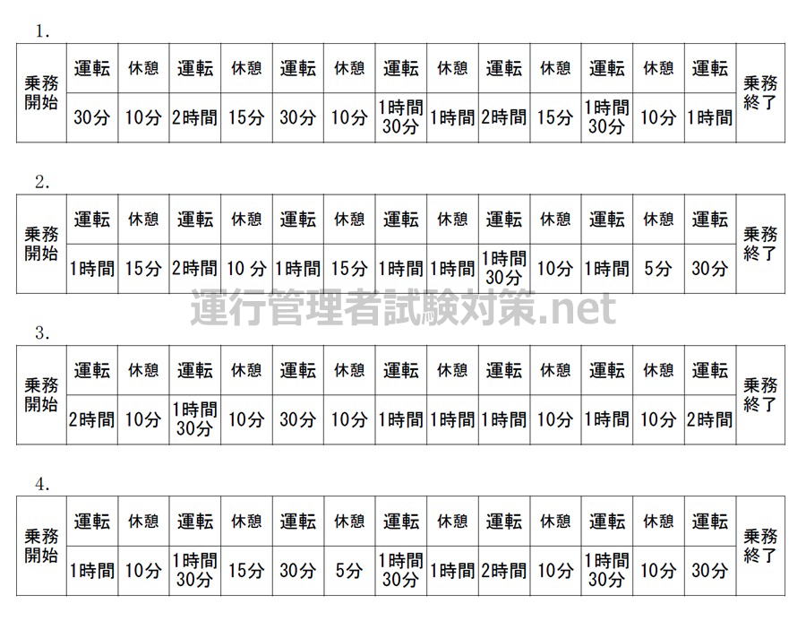問23 下表の1~4は、貨物自動車運送事業に従事する自動車運転者の運転時間及び休憩時間の例を示したものであるが、このうち、連続運転の中断方法として「自動車運転者の労働時間等の改善のための基準」に適合しているものを2つ選びなさい。なお、解答にあたっては、下表に示された内容以外は考慮しないものとする。