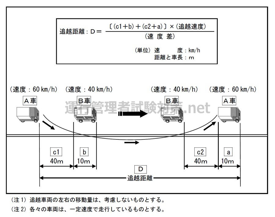 1.自動車が追越しをするときは、前の自動車の走行速度に応じた追越し距離、追越し時間が必要になる。前の自動車と追越しをする自動車の速度差が小さい場合には追越しに長い時間と距離が必要になることから、無理な追越しをしないよう運転者に対し指導する必要がある。