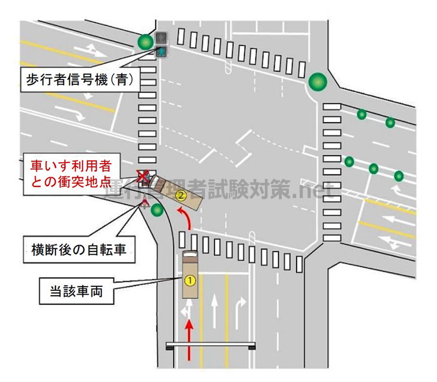 (2)運転者は、事故地点において、右方向から来る自転車のみに気を取られ、左方の安全確認を十分に行わなかったため、同横断歩道を左側から横断していた車いす利用者に全く気付かず進行し、車両の前部に衝突転倒させ轢過した。