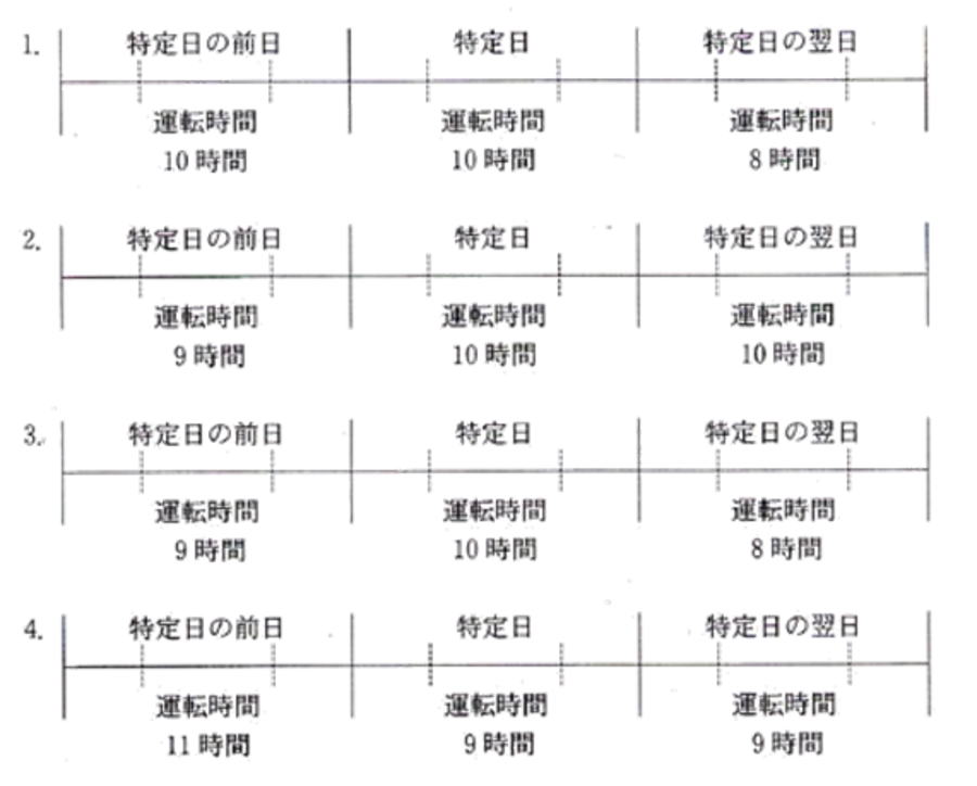 問22 下表は、一般貨物自動車運送事業に従事する運転者の特定日における運転時間を示したものであるが、このうち「自動車運転者の労働時間等の改善のための基準」に違反しているものはどれか。