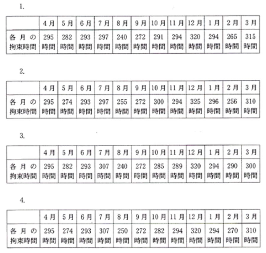 問23 下表は、貨物自動車運送事業に従事する運転者の1ヵ月の拘束時間を示したものであるが、このうち、「自動車運転者の労働時間等の改善のための基準」に違反しているものはどれか。なお、労使協定が存するものとし、年間の拘束時間は違反していないものとする。