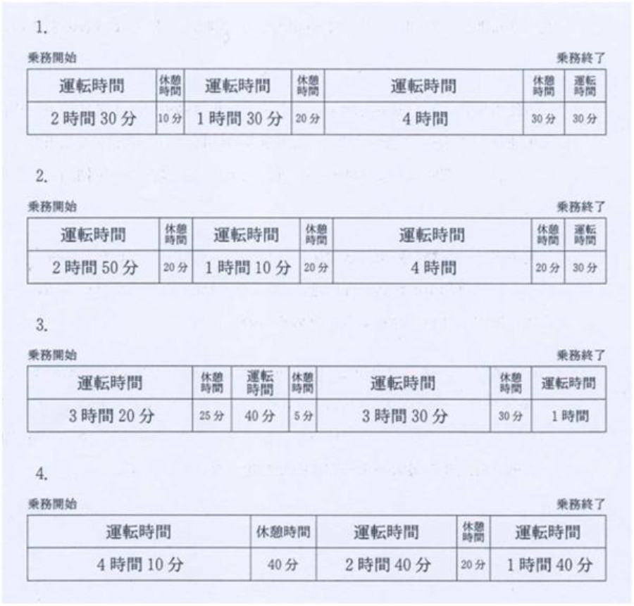 問21 下表は、貨物自動車運送事業に従事する運転者の運転時間及び休憩時間の例を示したものであるが、このうち、連続運転の中断方法として「自動車運転者の労働時間等の改善のための基準」に適合しているものはどれか。