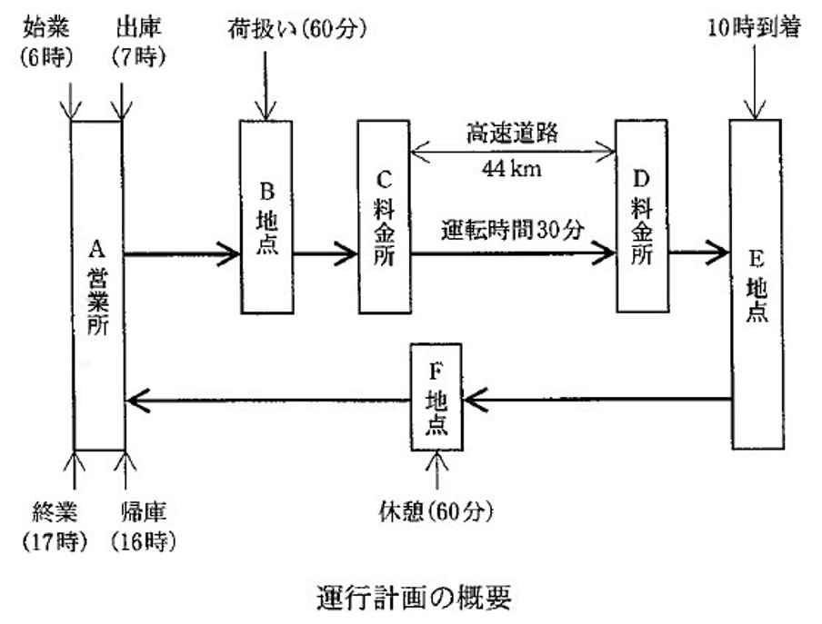キ E地点で荷物を降ろした後、F地点で60分休憩をとり、A営業所へ16時に帰庫する。