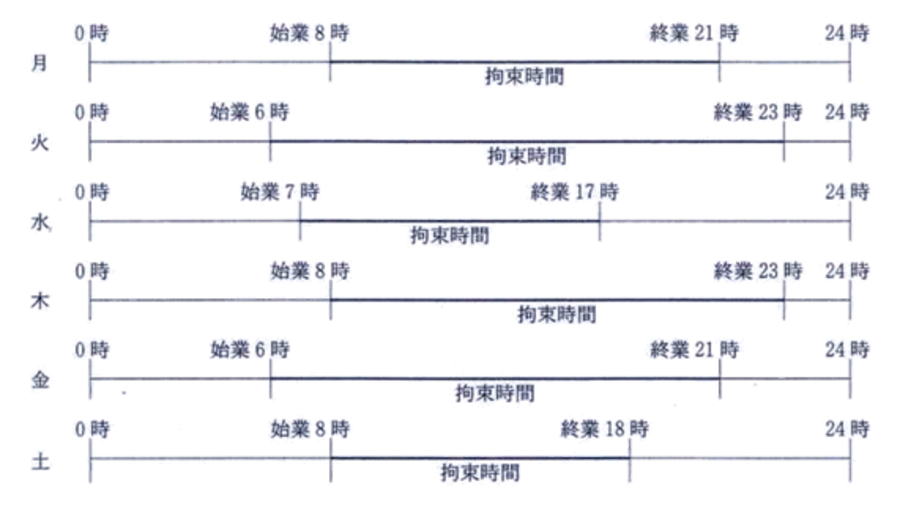 問23 下図は、貨物自動車運送事業に従事する自動車運転者の1週間の勤務状況の例を示したものであるが、「自動車運転者の労働時間等の改善のための基準」(以下「改善基準」という。)に定める拘束時間等に関する次の記述のうち、正しいものを1つ選び、解答用紙の該当する欄にマークしなさい。ただし、1人乗務で、フェリーには乗船しないものとし、また、業務の必要上、勤務の終了後継続して、定められた時間以上の休息期間を与えることが困難な場合には該当しないものとする。なお、日曜日は休日とする。
