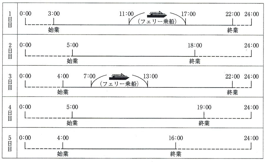 問22 下図は、貨物自動車運送事業に従事する自動車運転者の5日間の勤務状況の例を示したものであるが、次の1~4の拘束時間のうち、「自動車運転者の労働時間等の改善のための基準」における1日についての拘束時間として、正しいものを1つ選び、解答用紙の該当する欄にマークしなさい。なお、フェリー乗船時間は休息期間として取り扱うものとする。