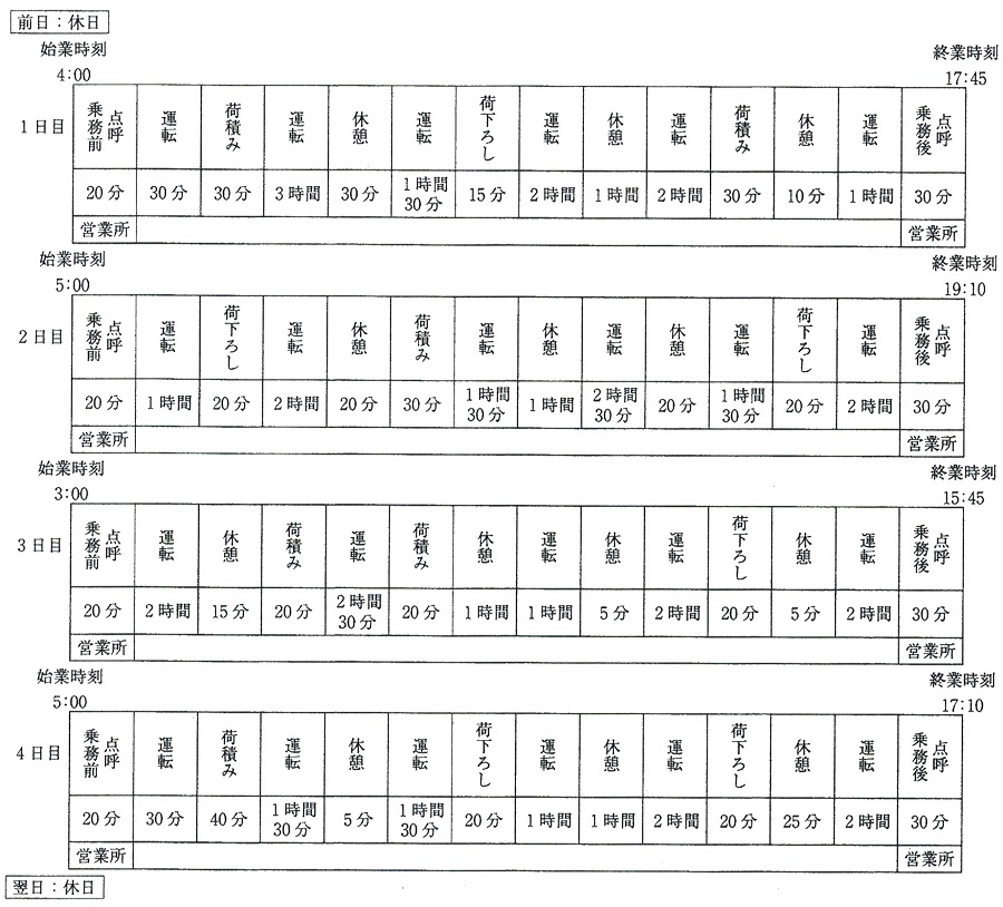2.当該運転者は前日の終業時刻は19時00分であり、また、当該運転者の翌日の始業時刻を3時30分としても、前日及び当日の各々の勤務終了後の休息期間は「自動車運転者の労働時間等の改善のための基準」(以下「改善基準」という。)に違反していないと判断したこと。