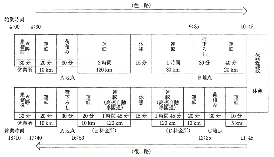 ウ 11時45分に休憩施設を出発してC地点に向かい、荷積みを行う。その後、12時25分にC地点を出発し、一般道を20分走行した後、D料金所から高速自動車国道(法令による最低速度を定めない本線車道に該当しないもの。)に乗り、途中15分の休憩をはさみ、3時間30分運転した後E料金所にて高速道路を降りる。(D料金所とE料金所の間の距離は240キロメートル)その後、一般道を20分走行し、荷主先のA地点に16時50分に到着する。荷下ろし後、20分運転して営業所に17時40分に帰庫する。営業所において業務後点呼を受け、18時10分に終業する。