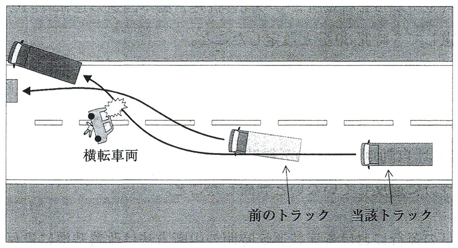 運転者及び交替運転者は、事故日前日の23時50分に営業所に隣接した車庫にて電話点呼を受けたのち、アルミサッシ類を積み置きしてあった車両総重量19トンの大型トラックにて出庫した。翌日(事故日)の23時30分に片側2車線の高速道路にて前方を走行していた大型トラックの後方約70メートルを時速90キロメートルで追従走行していたところ、前方の大型トラックが急に追い越し車線に進路変更したため、走行車線前方に横転していた車両の発見が遅れ、ハンドル操作で右に回避しようとしたが間に合わず当該横転車両に衝突した。この衝突の衝撃により当該横転車両に乗っていた運転者は車外に放り出され、頭部挫傷により死亡した。