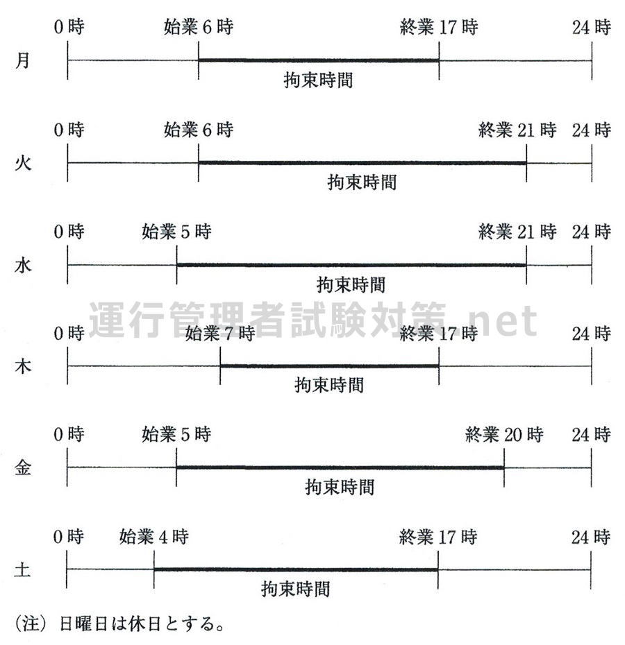 問22 下図は、貨物自動車運送事業に従事する、自動車運転者の1週間の勤務状況の例を示したものであるが、「自動車運転者の労働時間等の改善のための基準」(以下「改善基準」という。)に定める拘束時間等に関する次の記述のうち、正しいものを2つ選び、解答用紙の該当する欄にマークしなさい。ただし、すべて1人乗務の場合とする。なお、解答にあたっては、下図に示された内容及び各選択肢に記載されている事項以外は考慮しないものとする。