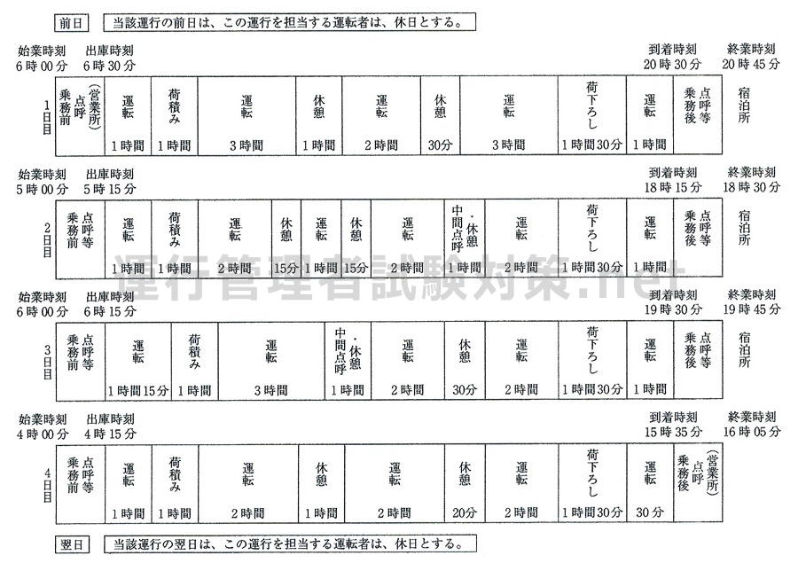 問29 運行管理者は複数の荷主からの運送依頼を受けて、下のとおり4日にわたる2人乗務による運行計画を立てた。この2人乗務を必要とした根拠についての次の1~3の下線部の運行管理者の判断について、正しいものをすべて選び、解答用紙の該当する欄にマークしなさい。なお、解答にあたっては、<4日にわたる運行計画>に記載されている事項以外は考慮しないものとする。