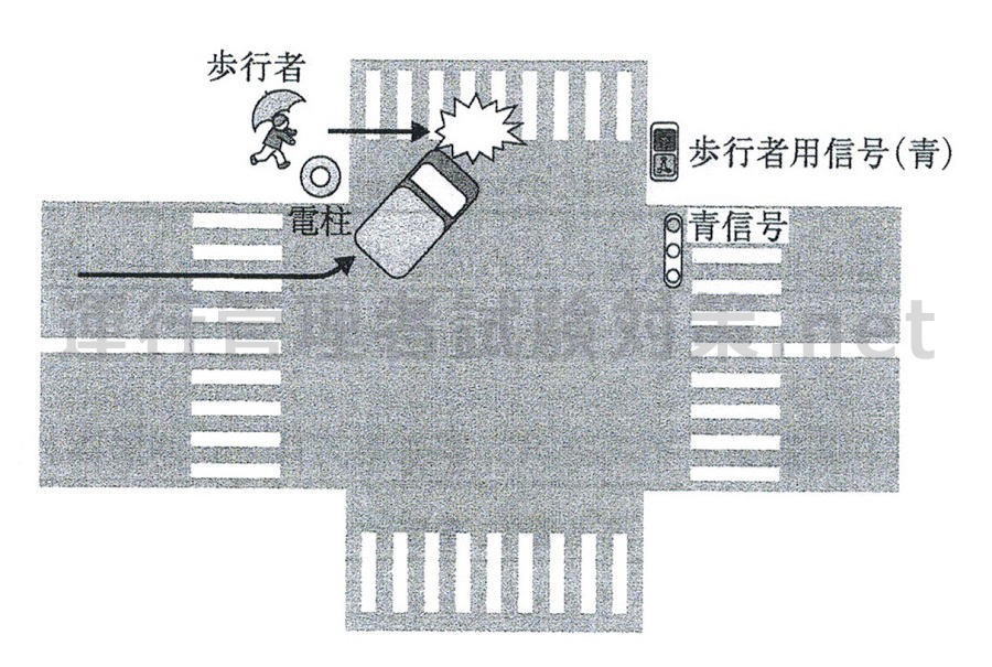 貨物自動車運送事業者の運転者は、青信号で交差点に進入し、左折しようとしたところ、電柱の影から飛び出してきた歩行者と衝突し、重傷を負わせた。
