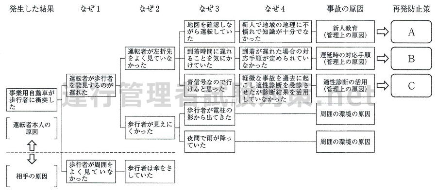 問30 貨物自動車運送事業者において、次の概要のような事故が発生し、運行管理者はこの事故原因を下記の【事故の原因分析】のとおり「なぜなぜ分析」を行った。この分析結果をもとに導かれた「事故の原因」に基づき、社内の同種事故を防止するためにより直接的に有効な再発防止策として表中のA、B、Cに当てはまるものを、【考えられる再発防止策】の中からそれぞれいずれか1つ選び、解答用紙の該当する欄にマークしなさい。なお、解答にあたっては、【事故概要】及び【事故の原因分析】に記載されている事項以外は考慮しないものとする。