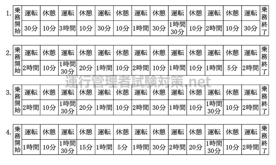 問22 下図は、貨物自動車運送事業に従事する自動車運転者の運転時間及び休憩時間の例を示したものであるが、このうち、連続運転の中断方法として「自動車運転者の労働時間等の改善のための基準」に【適合しているものを2つ】選びなさい。ただし、「高速道路等のサービスエリア等に駐車又は停車できないため、やむを得ず連続運転時間を延長できる場合」には該当しないものとする。(※法改正により一部改変)