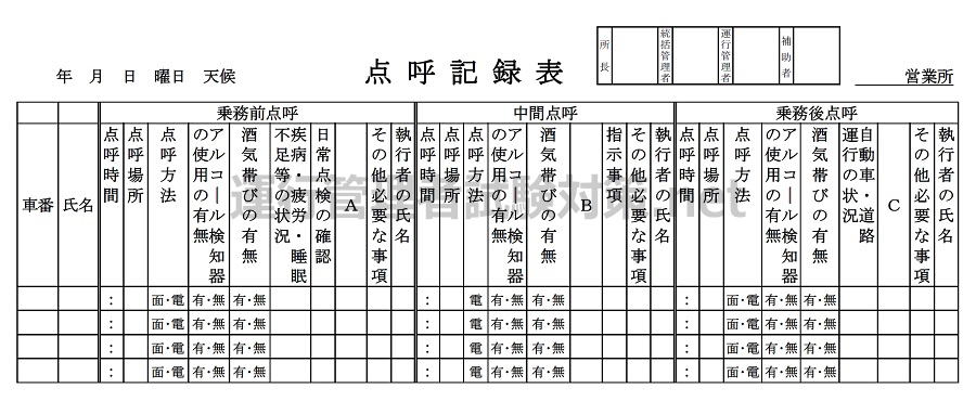 3.法令の規定により、運転者等に対して点呼を行い、報告を求め、確認を行い、及び指示を与え、並びに記録し、及びその記録を保存し、並びに運転者に対して使用するアルコール検知器を備え置くこと。