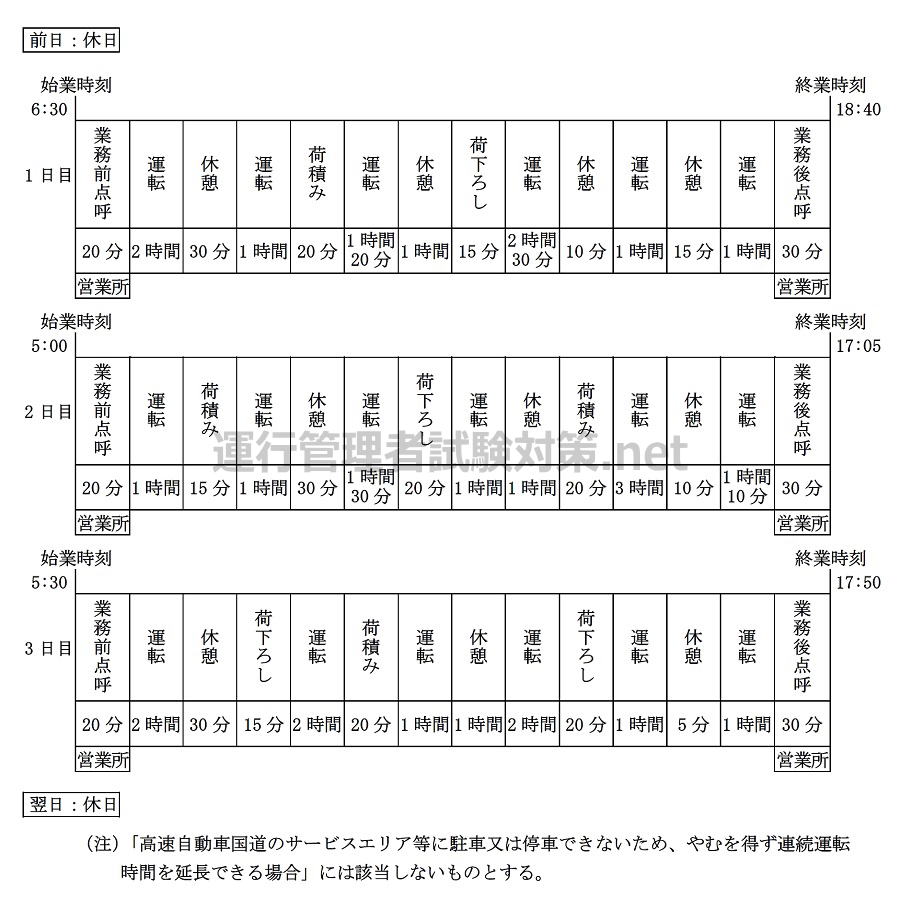 3.連続運転時間が改善基準告示に違反している勤務日は、1日目及び3日目であり、2日目は違反していない。