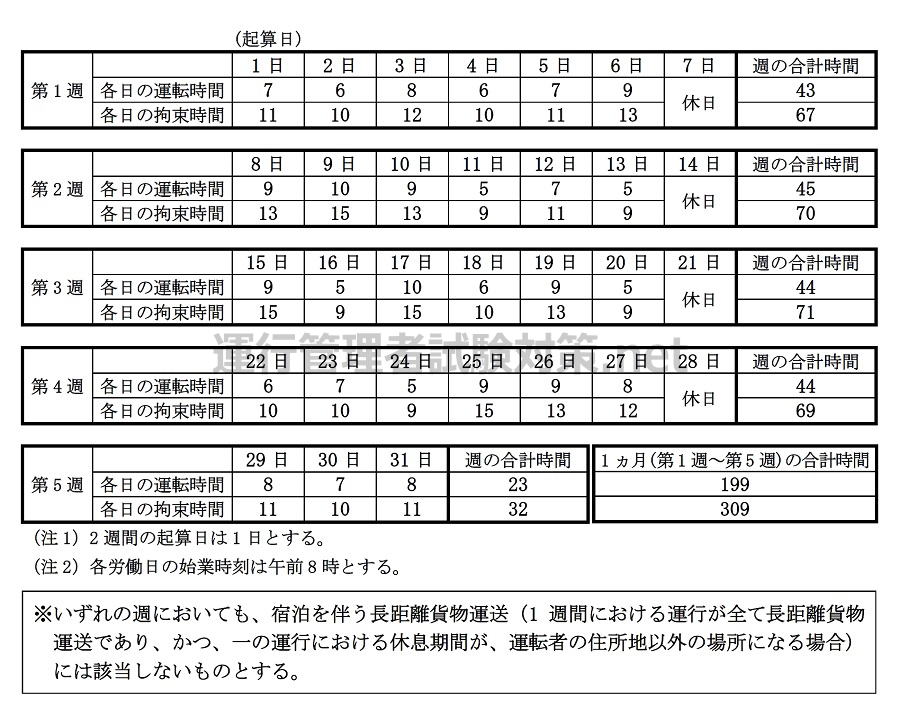 問23 下表は、貨物自動車運送事業に従事する自動車運転者の1ヵ月の勤務状況の例を示したものであるが、「自動車運転者の労働時間等の改善のための基準」に定める拘束時間(拘束時間が14時間を超える1週間の回数についての目安を含む。)及び運転時間等に照らし、次の1~4の中から違反している事項をすべて選び、解答用紙の該当する欄にマークしなさい。なお、1人乗務とし、「1ヵ月についての拘束時間の延長に関する労使協定」があり、下表の1ヵ月は、当該協定により1ヵ月についての拘束時間を延長することができる月に該当するものとする。また、「時間外労働及び休日労働に関する労働協定」があるものとする。(※法改正により一部改変)