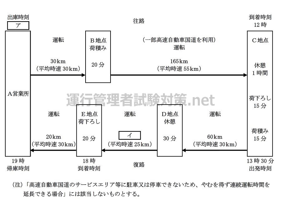 〇 B地点から165キロメートル離れたC地点までの間、一部高速自動車国道を利用し、平均時速55キロメートルで走行して、C地点に12時に到着する。1時間の休憩後、15分間の荷下ろしを行う。