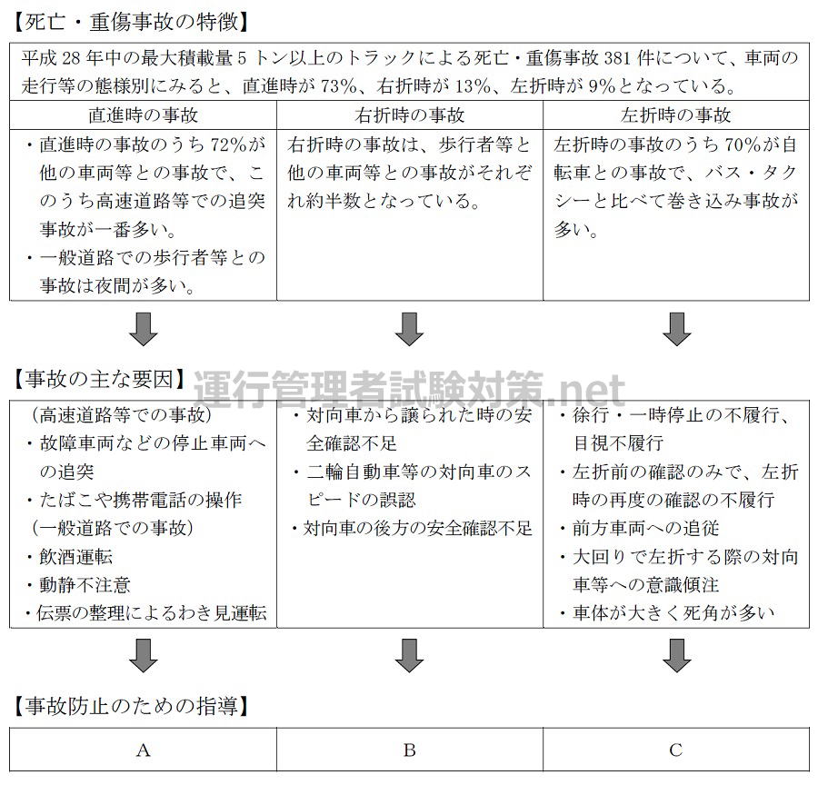 問7 一般貨物自動車運送事業者の事業用自動車の運行の安全を確保するために、事業者が行う国土交通省告示で定める特定の運転者に対する特別な指導の指針に関する次の文中、A、B、Cに入るべき字句としていずれか正しいものを1つ選び、解答用紙の該当する欄にマークしなさい。