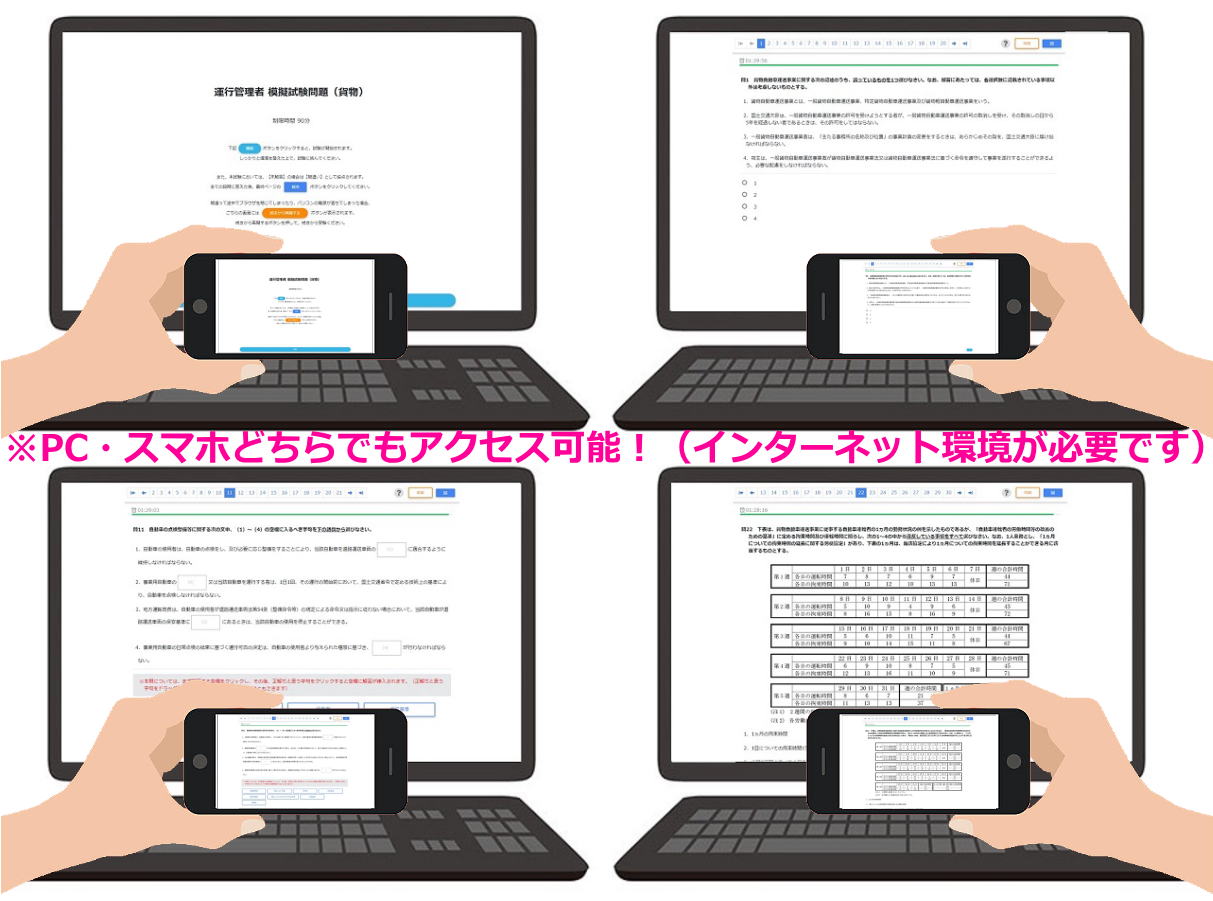 運行管理者試験は、問題用紙やマークシートを使用せず、パソコンの画面に表示される問題に対しマウス等を用いて解答するCBT方式で実施されるので、CBT試験を疑似体験することで大きな自信につながります!